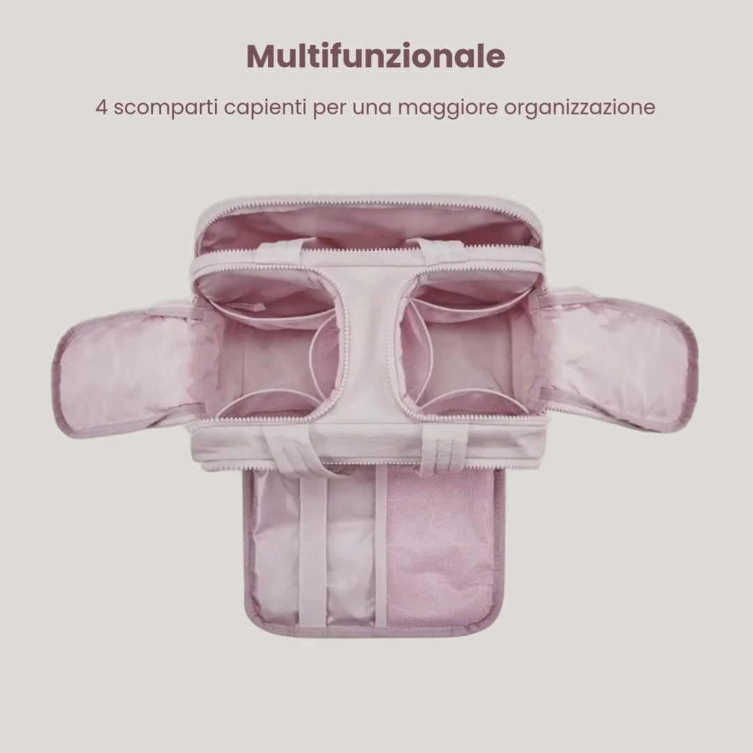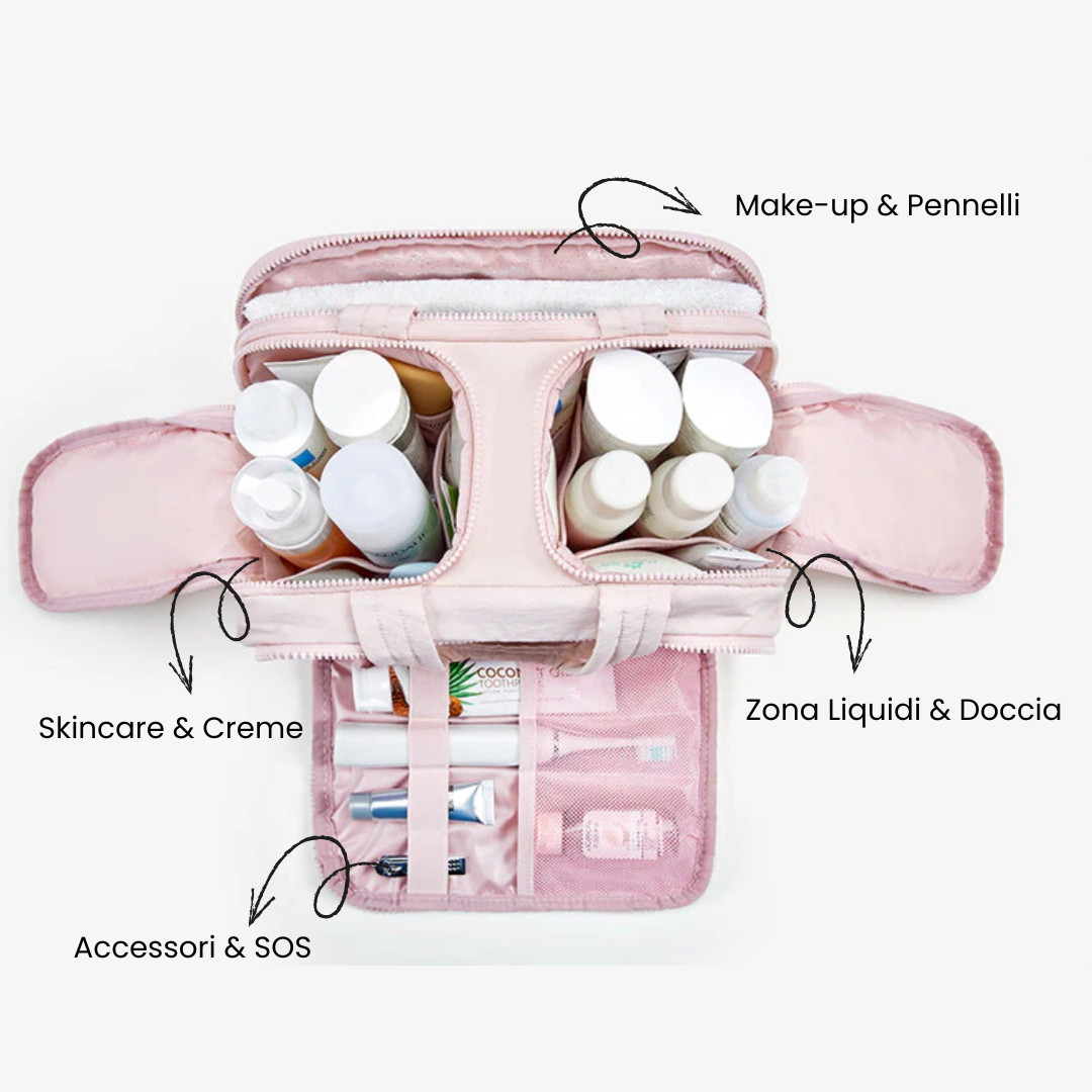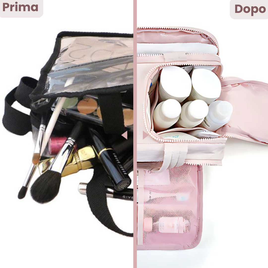 Sì. I 4 scomparti separati ti permettono di organizzare skincare, make-up, shampoo e accessori senza comprimere o rovesciare nulla.